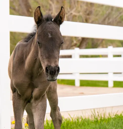 "Fast Forward" is a beautiful Grulla Roan Filly. That's her name because she does everything very quickly! She zooms here and zooms there. She has a very curious nature and would whinney for you from her stall. She has a pretty disposition and although she was born grulla, we believe she is shedding out to be roan. We are excited to see what color she'll actually end up!